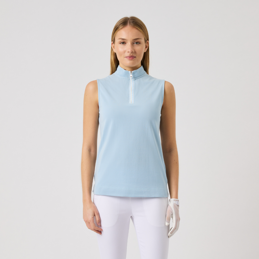 Vill du ha golfkläder till dam med en feminin och sportig attityd, då ska du köpa den ärmlösa golfpikéen Kim SL Polo från Daily Sports. Ståkragen tillsammans med dragkedjan och den ärmlösa design skapar en stilsäker look på golfbanan. Toppen framhäver dina bästa sidor med en lösare passform nertill. Toppen är dessutom tillverkad i ett material som både stretchigt och andas.